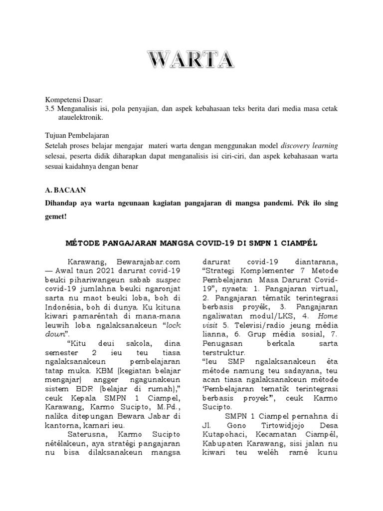 Dec 03, 2017 · kecap warta teh ngandung harti beja, bewara,atawa informasi.nepikeun warta hartina neupikeun beja.