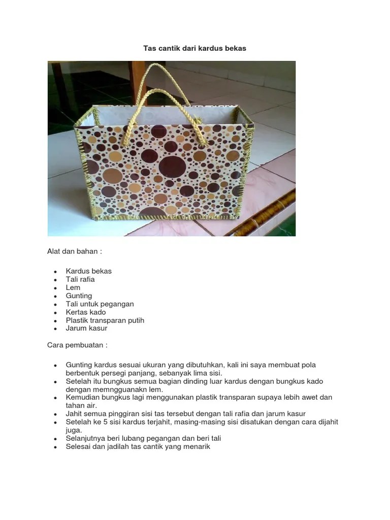 Cara Membuat Tas Cantik Dari Kardus Bekas : Cara Membuat Tas Cantik Dari Kardus Bekas Docx D4pqx8m8p6np - Sampah kardus dapat dimanfaatkan kembali secara optimal, yaitu dengan cara didaur ulang menjadi sebuah kerajinan tangan yang memiliki nilai jual .. Kreasi unik kerajinan tangan dari kardus bekas . Cara mudah membuat tas cantik dari kardus satu jam. Cara pembuatan tas cantik dari kardus bekas adalah : Ide kreatif dari kotak susubisa menjadi bahan baku untuk . Tas cantik dari kardus untuk memanfaatkan kardus bekas menjadi barang yang.